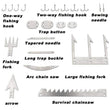 Combination: trap button, saw blade, fish hook, arrow, cone needle, sewing needle,